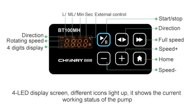 BT100MH is a type of low flow peristaltic pump. The flow rate range is from 0.0015 to 480mL/min. With a unique flow calibration function and power-off save function. Key operation peristaltic dosing pump. Easy to operate. Adopts the stainless shells, durable and corrosion. Unique back suction anti-drip function, which can effectively prevent liquid from dripping. The BT100MH pump can be installed with YZ1515x, YZ2515x, and DG pump heads.